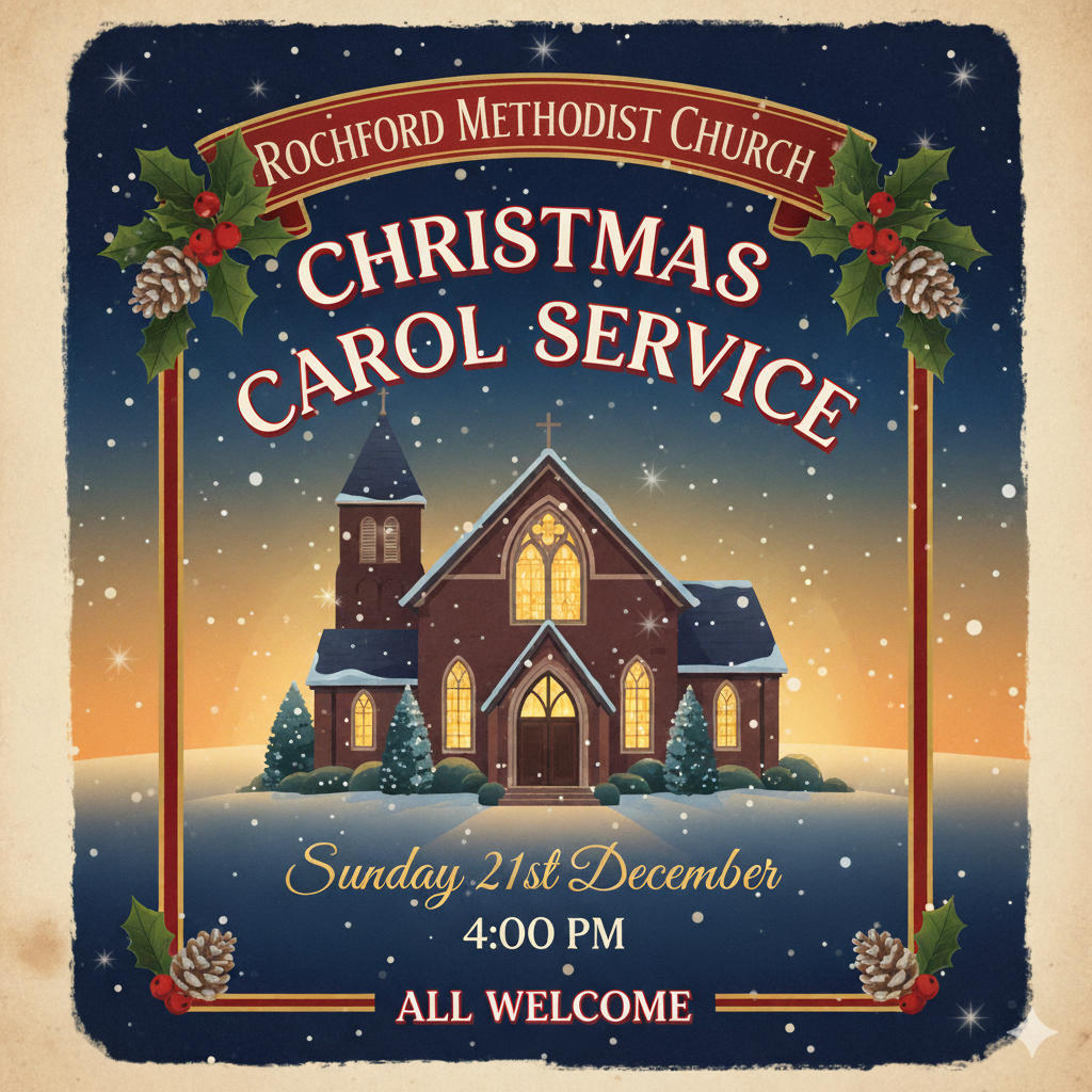 Carol Service - 21 December – 4.00pm – This service will be a local arrangement led by the Worship Leaders. All are welcome to join us for our service of traditional Christmas carols and readings. There will be festive nibbles and other refreshments following this service that everyone is welcome to stay for.