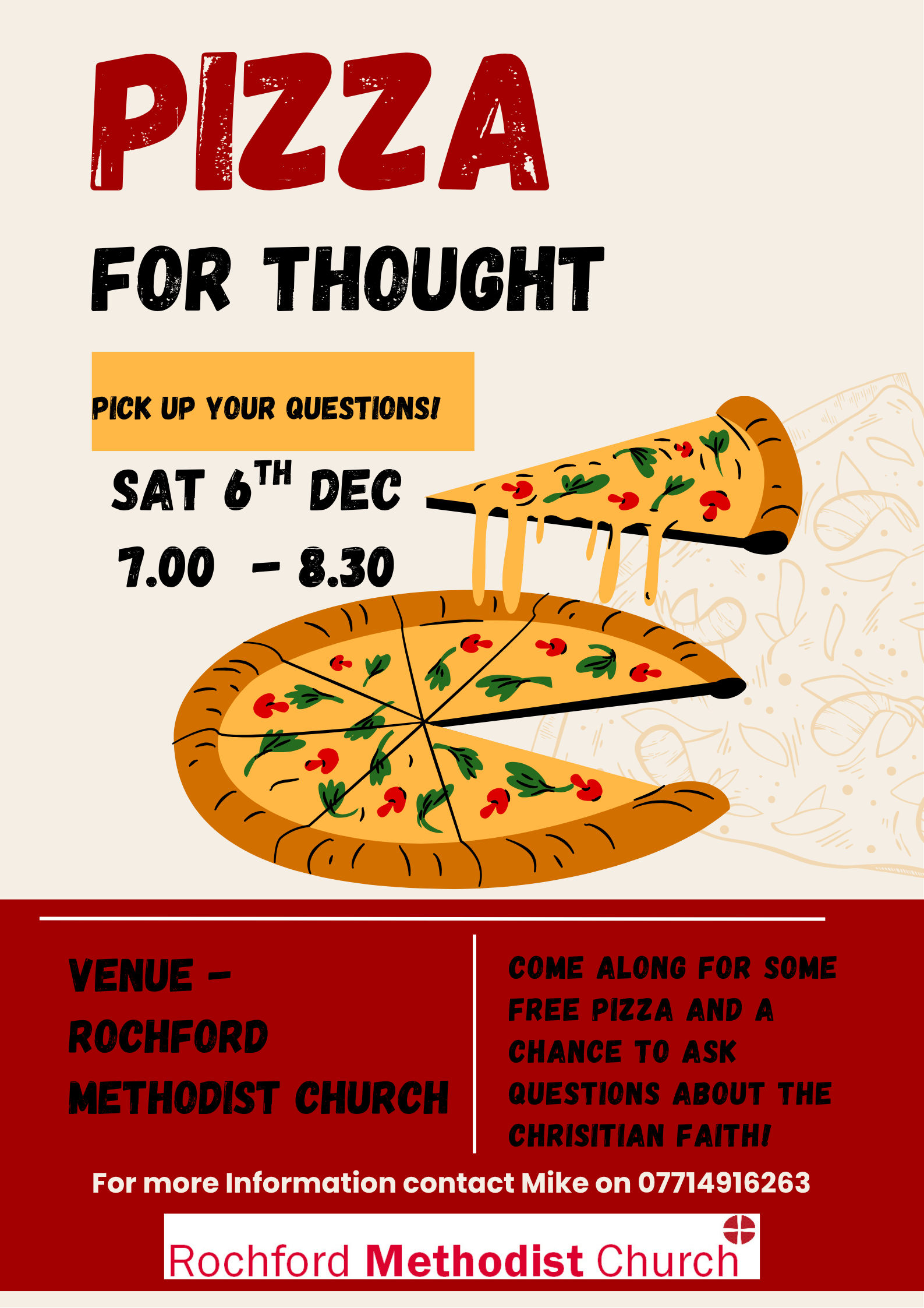 Pizza for Thought - 6 December - 7.00 - 8.00pm - Come along for some free pizza and a chance to ask questions about the Christian faith! For more information, contact Pastor Mike on 07714 916263.